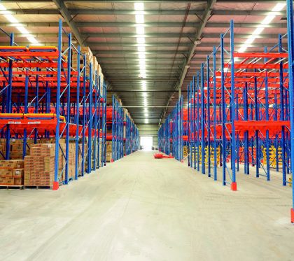 VNA racking system reduces aisle width of pallet racking, uses track guided specialized VNA lift trucks, increasing storage density by converting conventional storage space into vertical storage system.