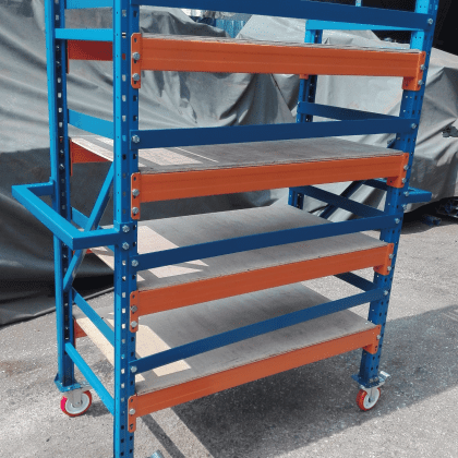Spacious racking with wheels designed for easy and convenient storage in your warehouse. Loads from both front and back sides, lightweight and easy to move around.